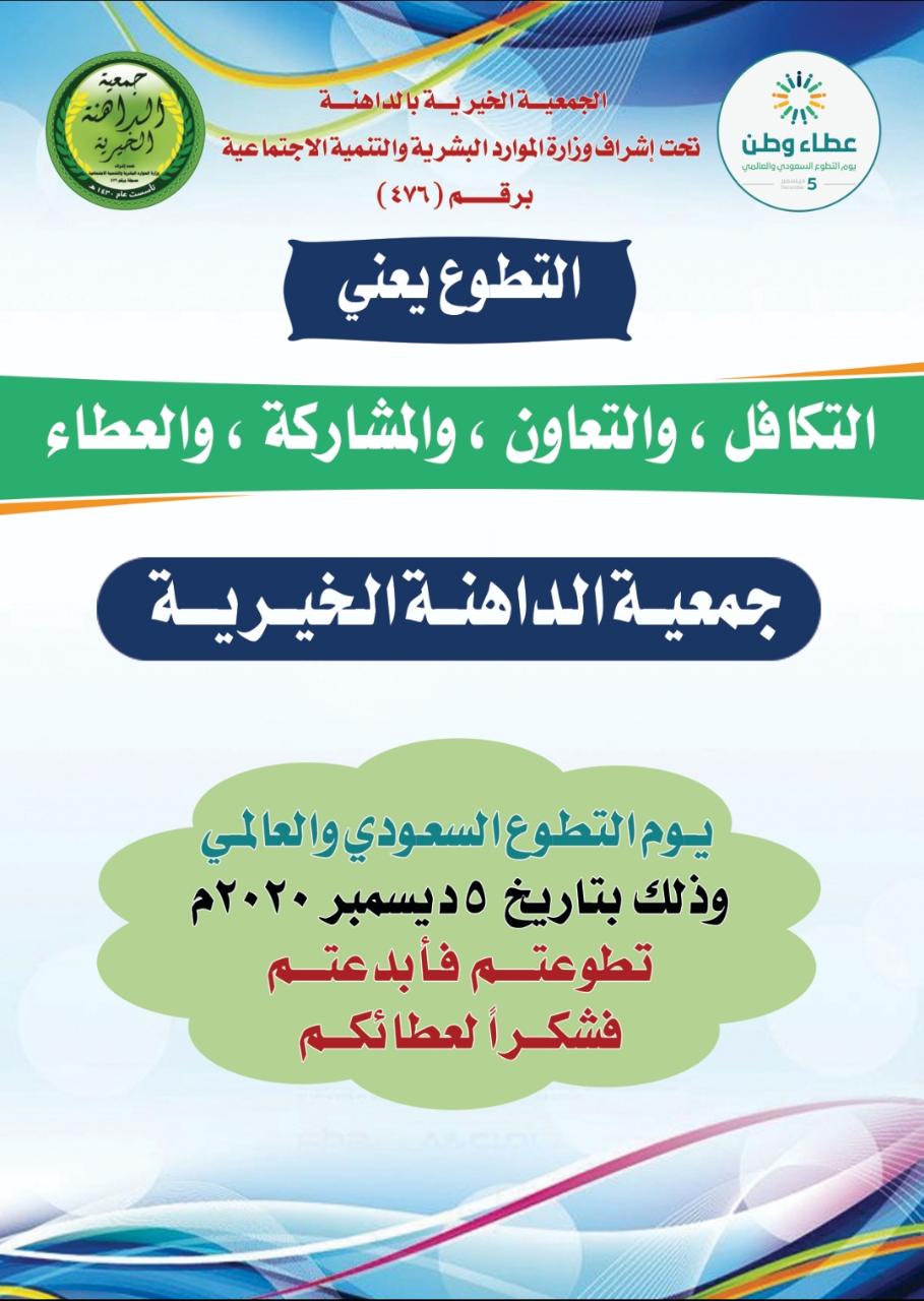 شاركت جمعية الداهنة الخيرية في تفعيل يوم التطوع السعودي العالمي بمشاركة المتطوعين والذي كان لهم الدور الرئيسي الفعال في إنجاح تلك المبادرة .